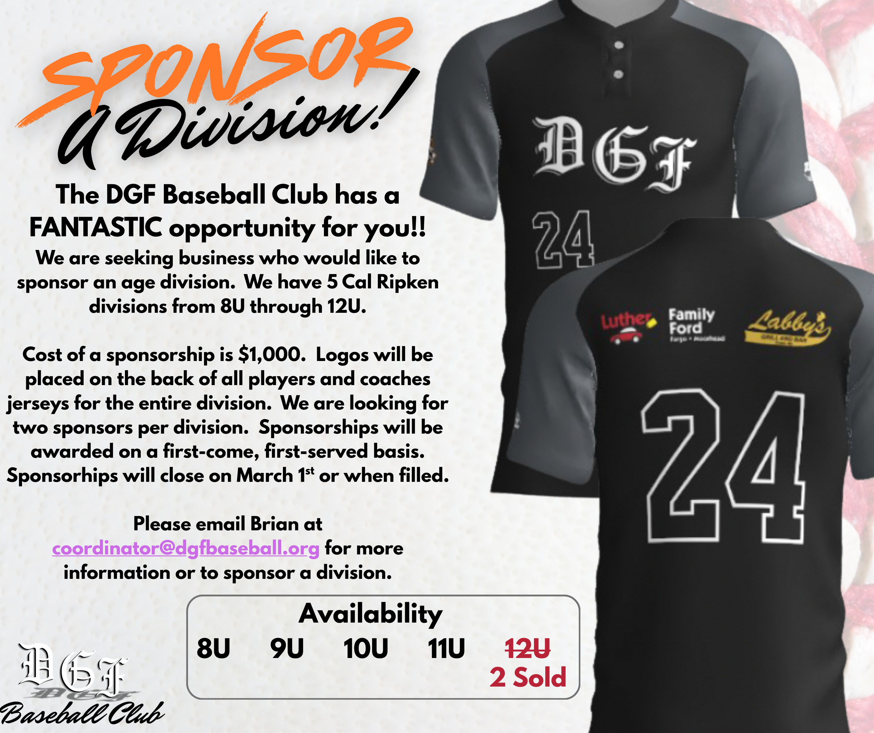 Great news! DGF Baseball Club Cal Ripken Program is now offering Divisional Sponsorships!