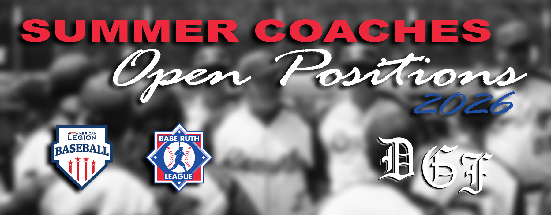 The DGF Baseball Club has coaching opportunities in its JR Legion and Babe Ruth baseball programs for 2026. These are paid positions in the June-July summer timeframe. If you have a passion for educating youth in the sport of baseball, you are encouraged to learn more at www.DGFbaseball.org/employment. You can submit an application using the PDF on the employment page. You can send the Program Directors an email with any questions to coordinator@dgfbaseball.org.